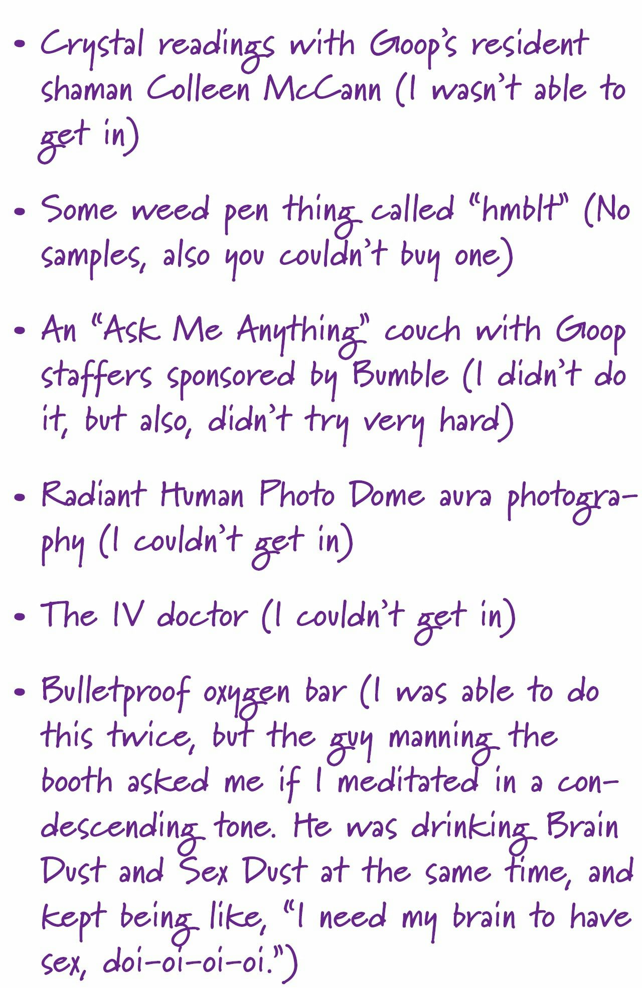 All told, despite its promised spectacle and ample access to Amanda Chantal Bacon’s fine wares, the Goop conference was a deeply boring day filled with tedious waiting and hypochondria. When I finally stumbled out of the Collagen Garden three vodka drinks deep, after chatting exclusively with women who were also sent to the Goop conference because a higher power or their employers paid for it, I felt nauseous and leaden. I hulked from the garden to the patio to my goody bag, past the shaman collecting her stones and the nurse practitioners from the IV bar disposing of their sharps, stopping one more time at the aura photography station to see if they could squeeze me in. They couldn’t squeeze me in.