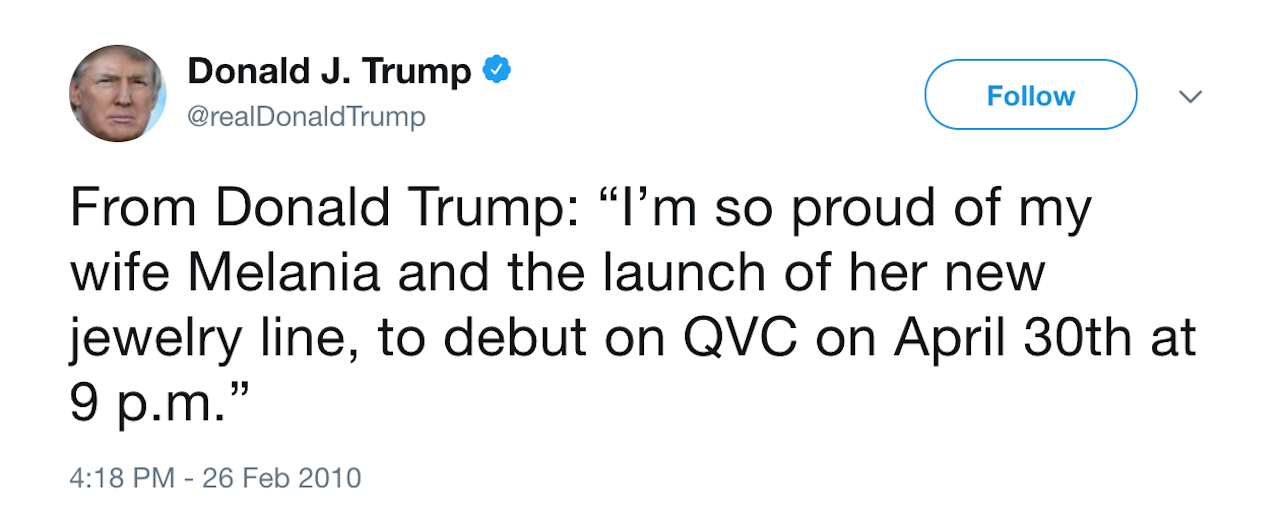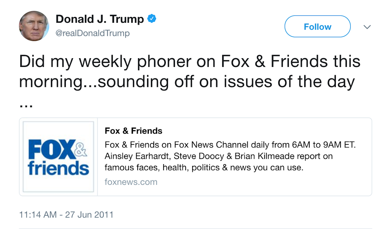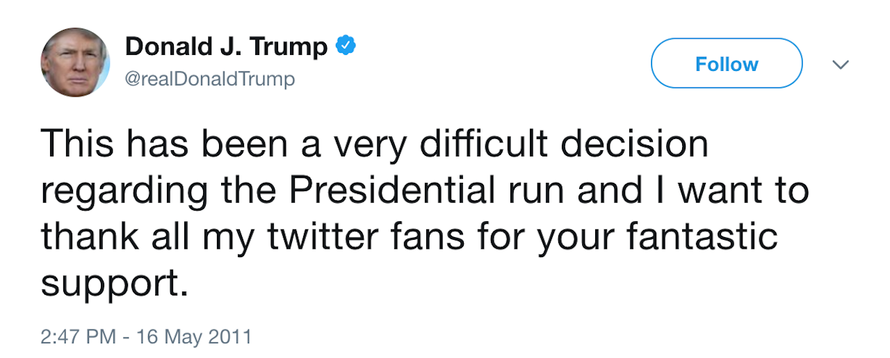 Concurrently, outside the Twitterverse, Trump was quite outspoken about politics. By March 2011, he was proudly endorsing birtherism on Fox News and elsewhere. Nevertheless, this fervor never permeated into his Twitter feed. Instead, his 300,000-some followers would see this: