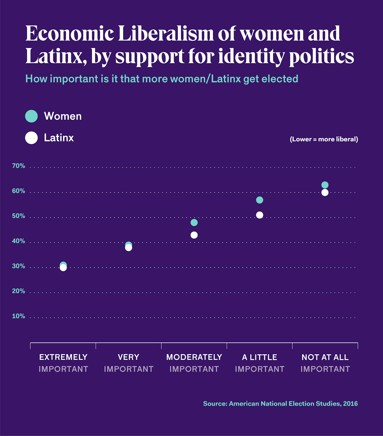 Far from deterring individuals from economic liberalism, identity politics is associated with more support for progressive economic policy. To show this, I used American National Election Studies data from 2016 to create a ten-question index of economic issues, including support for regulation of banks, a millionaire's tax, a scale of support for guaranteed jobs, and other progressive economic proposals. I then ran a regression analysis to see if support these policies among women was associated with views on whether it was to elect women to higher office, a measure of what might be called “identity politics.” I found that support for identity politics was strongly associated support for economically liberal policies, even controlling for race, college, ideology, age, family income and partisanship. I performed the same analysis among Latinx voters (using a question that asked how important it was to election Latinx to office), and found a similar result.