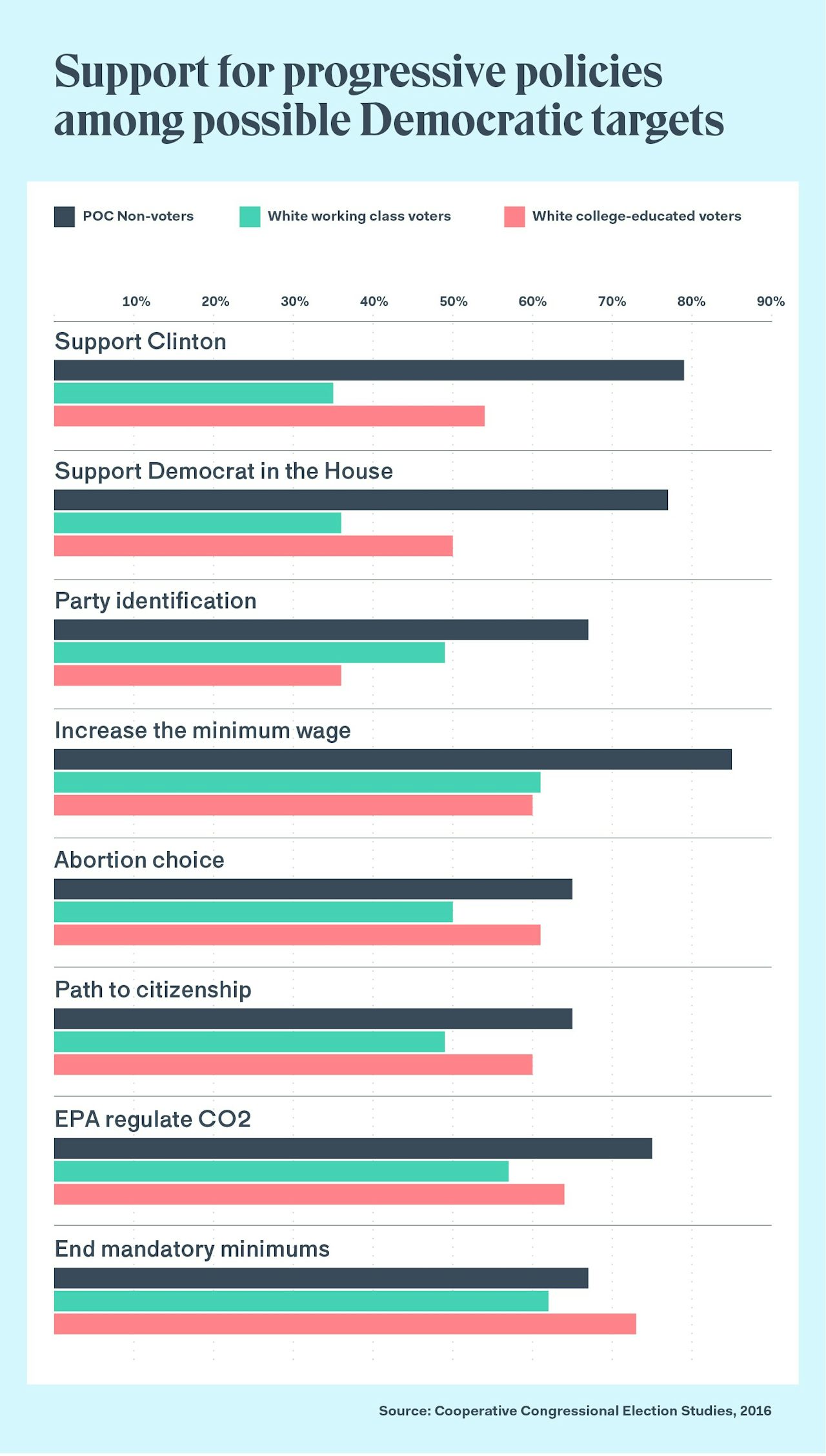 To examine the best way forward for progressives in the Democratic Party, I analyzed data from the Cooperative Congressional Election Studies 2016 survey. I looked at three groups that Democrats could target: non-college whites, college whites, and non-voters of color. As the chart below shows, non-voters of color are more supportive of a higher minimum wage, environmental regulation, abortion rights, and a path to citizenship. While 35 percent of working-class white voters and 54 percent of college-educated white voters supported Clinton, 79 percent of non-voters of color did. People of color were also far more likely to identify as Democrats.