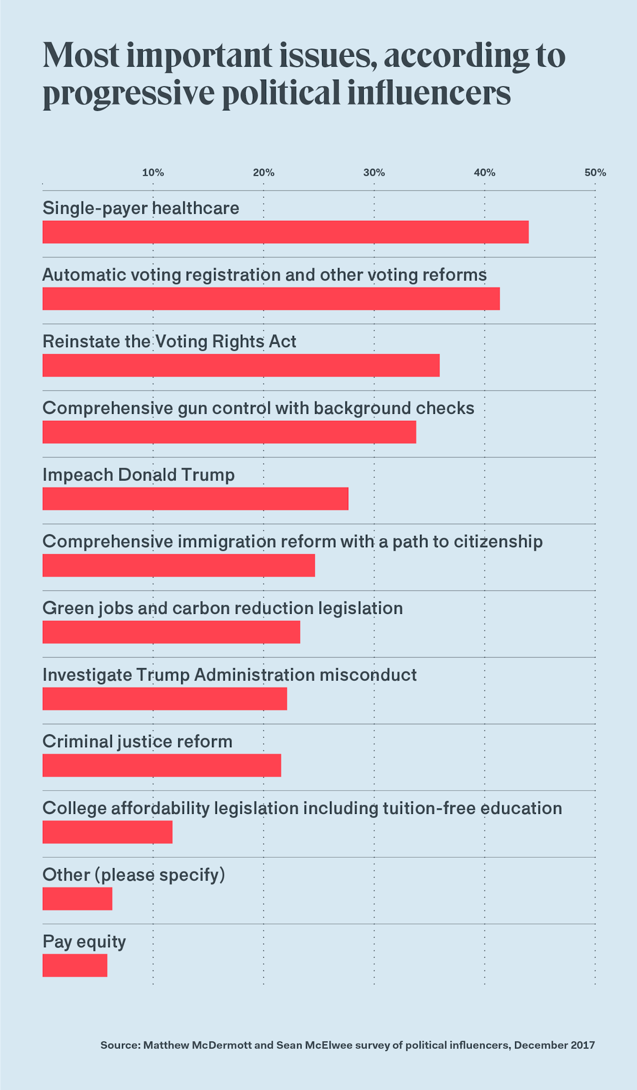Eight other issues, including college affordability, pay equity, green jobs, and investigating the abuses of the Trump administration, were cited less frequently than gun control. So as much as progressives want to impeach Trump (a lot), they want gun control more. Additionally, 85 percent of the influencers we surveyed said they “strongly support” comprehensive background checks, suggesting the party is mostly united around the issue.