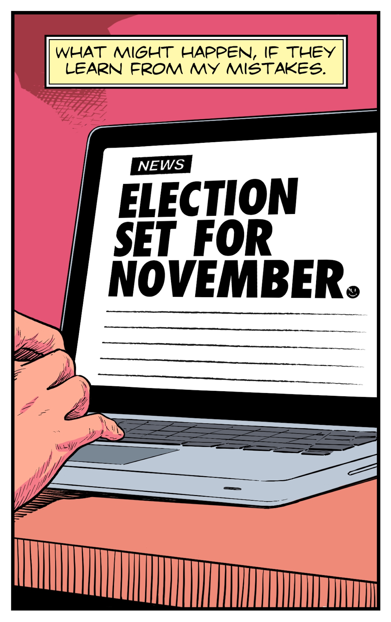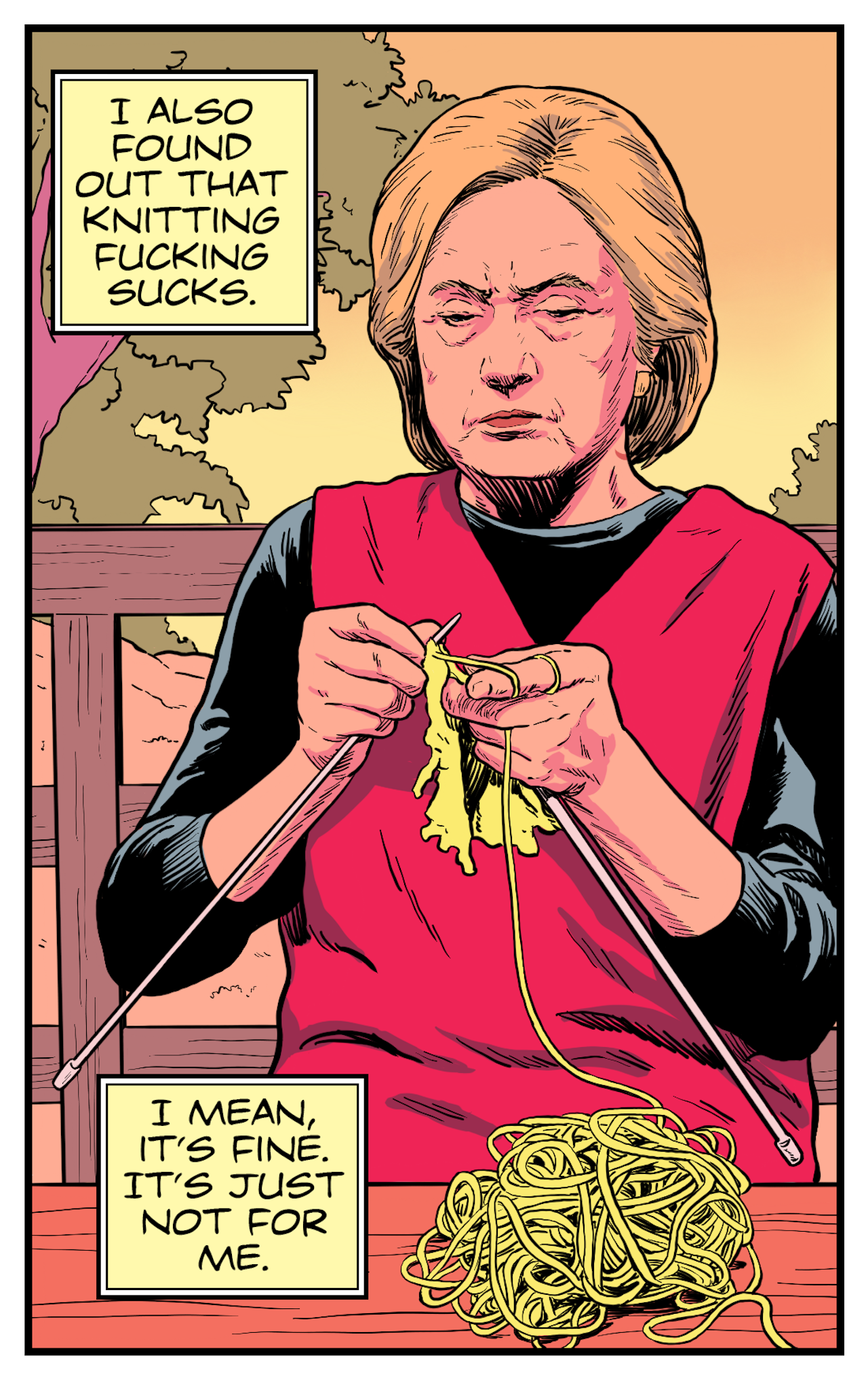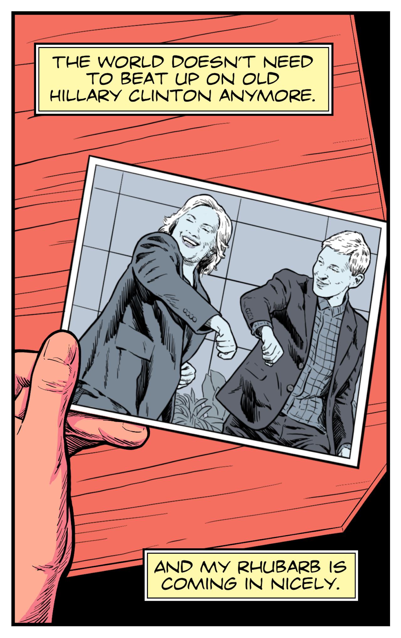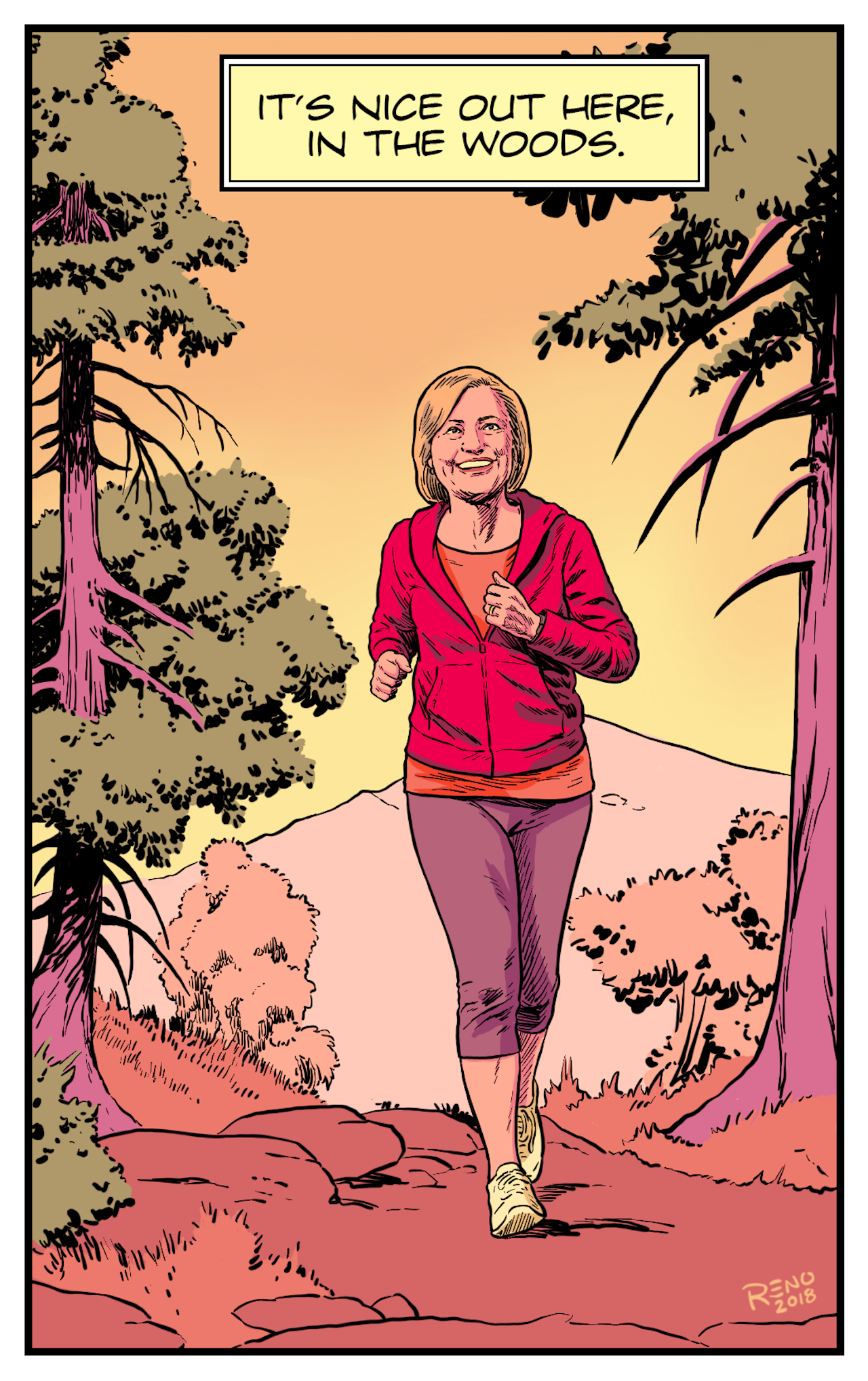 Jeremy Gordon and Reno Maniquis May—23—2018 01:37PM EST Whatever happened to Hillary Clinton?Read them allWho watches the men? #1: Trump risesWho watches the men? #2: Hillary's escapeWho watches the men? #3: New electionsWho watches the men? #4: Bernie’s journalWho watches the men? #5: Meet Fearless GirlWho watches the men? #6: Up in the woods, down on my mindWho watches the men? #7: All systems goWho watches the men? #8: An unbelievable turn of eventsWho watches the men? #9: Election Day approachesWho watches the men? #10: End of an empireWho watches the men? #11: Nothing ever ends Reno Maniquis is an illustrator and graphic artist.