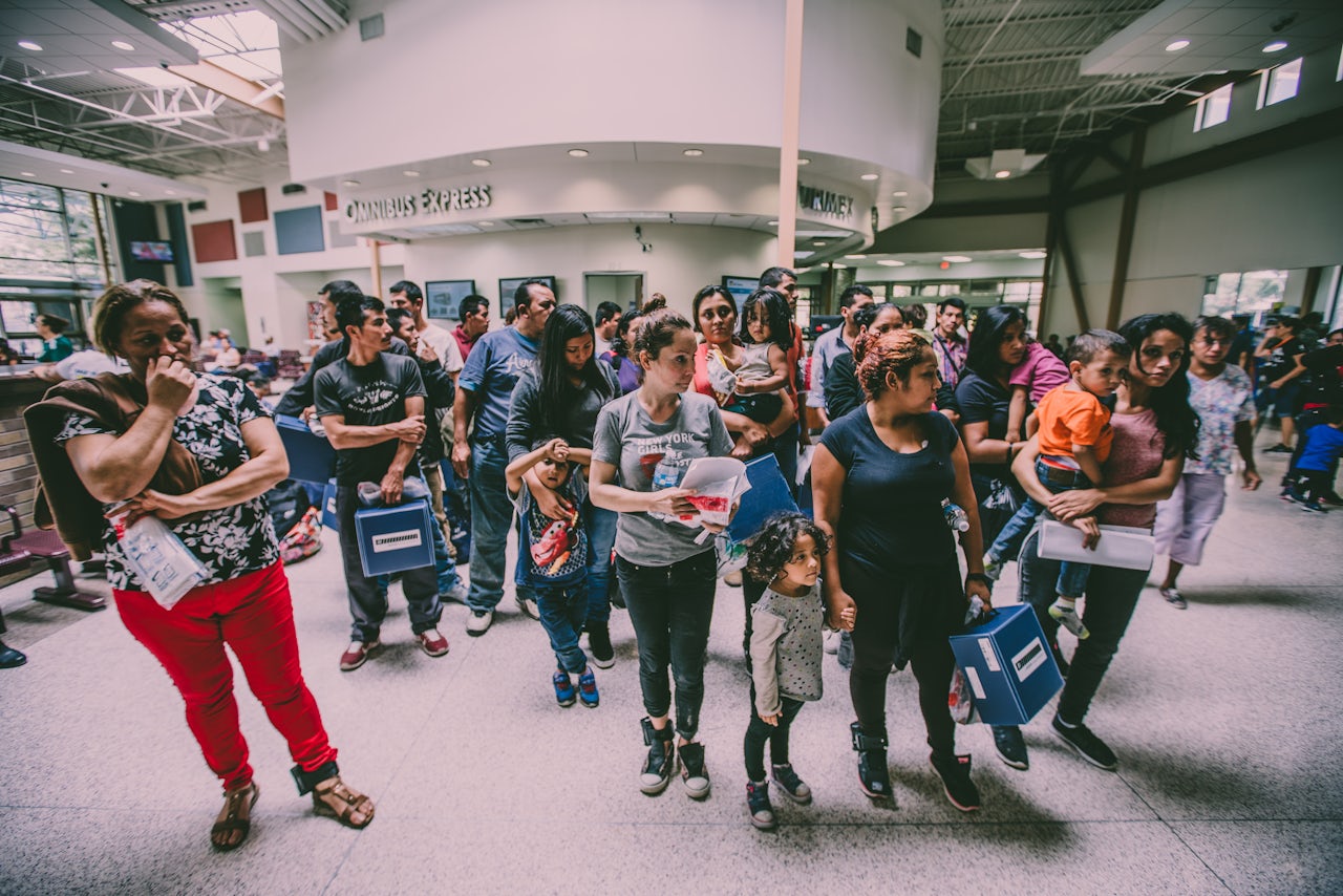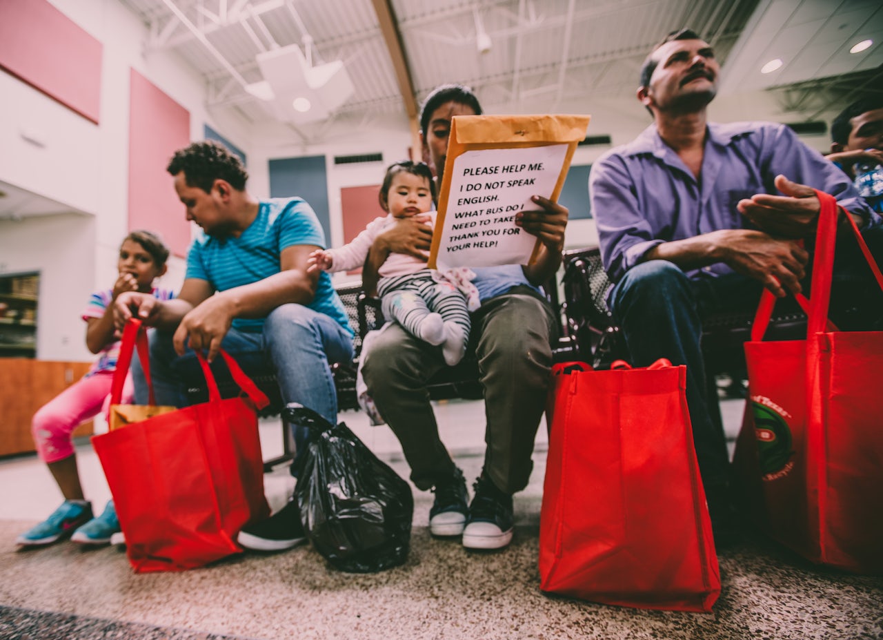 There were dozens of families at the terminal that evening, each with a yellow envelope that contained information about their upcoming hearings. Most had a sheet stuck to the front of that envelope that read: “PLEASE HELP ME. I DO NOT SPEAK ENGLISH. WHAT BUS DO I NEED TO TAKE? THANK YOU FOR YOUR HELP!” On the back of the envelope were the details of their journeys; some of the families were headed to Dallas, others to Florida, New York, and Virginia, and one as far as Maine. They may be among the last families to be released from detention to stay with friends and relatives in the U.S. while they wait for their cases to be processed.