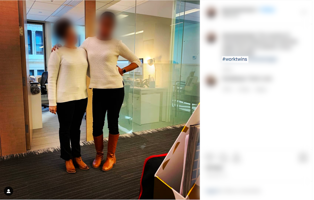 There’s another, more disturbing, connotation to the phrase worktwin: when people of color are confused with one another by their white colleagues. A Washington Post article earlier this year described how such employees have dubbed one another their worktwins: “The implication is that, while white people are seen as individuals, other groups are often viewed as a monolith, with their race or ethnicity becoming the defining characteristic of who they are.” Worktwins of this sort are trapped in a far more demeaning and private experience of mis-identification, their race being the thing their colleagues can’t look past. Nobody is posting about this type of worktwin on their company’s Instagram.
