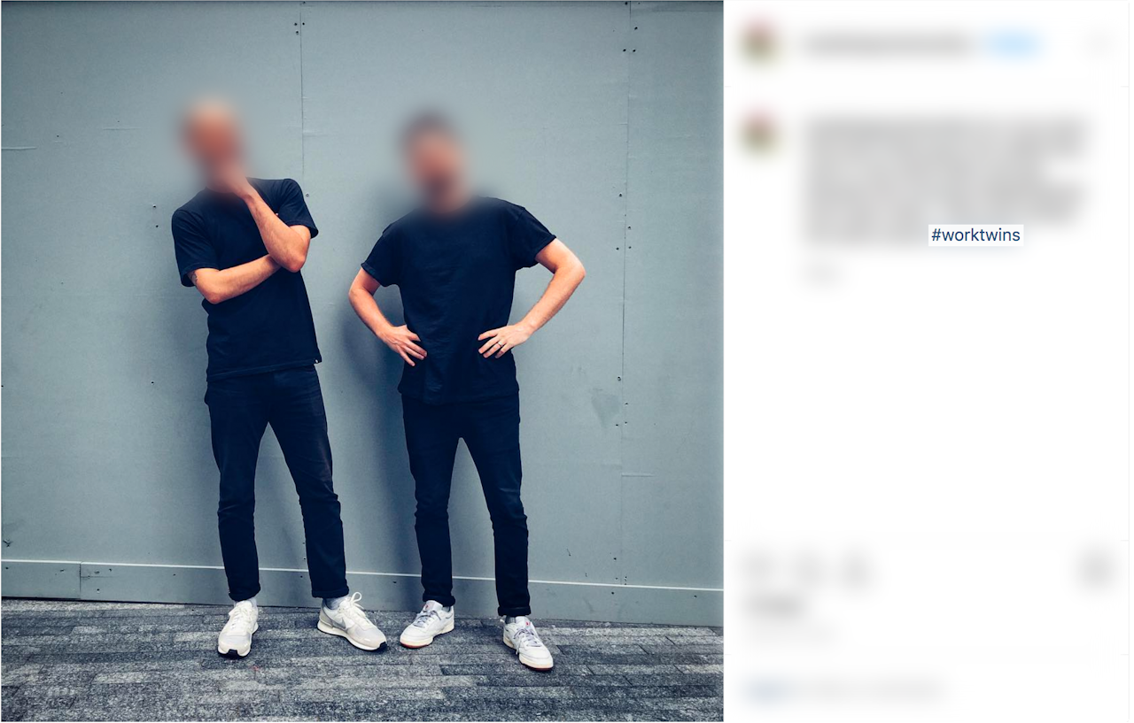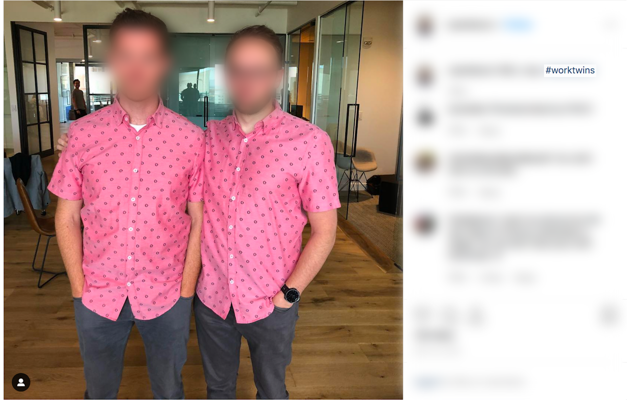 Finally, there were the worktwins whose discomfort proved that worktwinning was just another reason to hate work. They didn’t like being reminded of all the hours they spent at the office and seemed agitated by their coworkers gathering around to gawk at the banal fact of two people dressing alike. They would much rather sit down, login, and get paid without having to participate in this bizarre trope of office life. These worktwins — indignant and resistant — were the ones with whom I empathized the most.