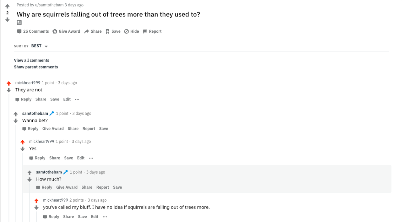 A Redditor asked why squirrels were falling out of trees more often these days. Mick said that they were not. The Redditor said they were. Mick said that they were not. There is no evidence I can find that might indicate that squirrels are or are not falling out of trees more often, so perhaps the creator of that post had been hoping to find some by making a wildly outlandish claim. Instead, they got me. The squirrel person then challenged me to a cash bet, so I backed down. I half-heartedly tweeted some predictions about NFL games that weren’t actually happening, but nobody was biting. That was my Sunday.