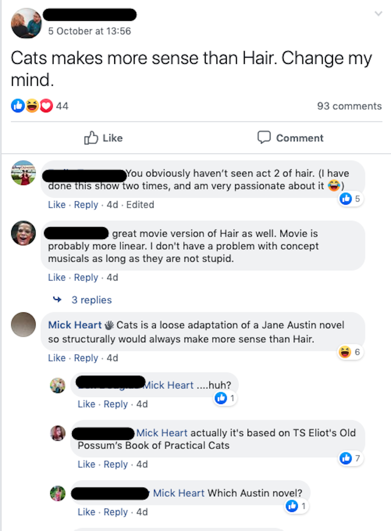 Question from someone in All Things Broadway Facebook group: “Cats makes more sense than Hair. Change my mind.”
