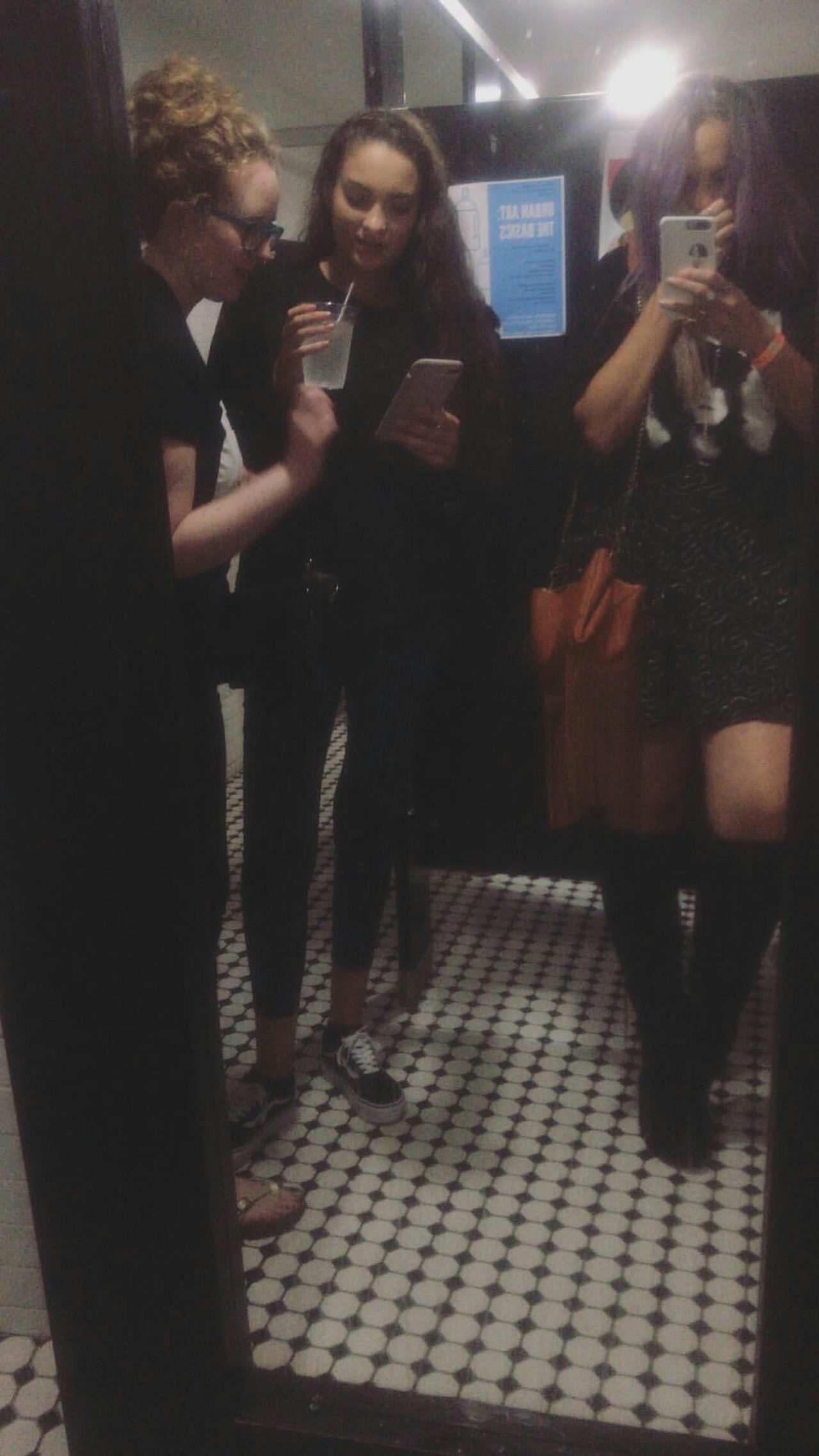 I was waiting in line for one of the two bathroom stalls; three girls were holding up the large one. I quickly checked the effectiveness of my eye liner in the mirror, just as a girl in a short, blue dress with black leopard print and a ‘60s half up hairstyle sent some bathroom stall graffiti-esque empowerment my way: “Girl, you look amazing, don’t even worry!”